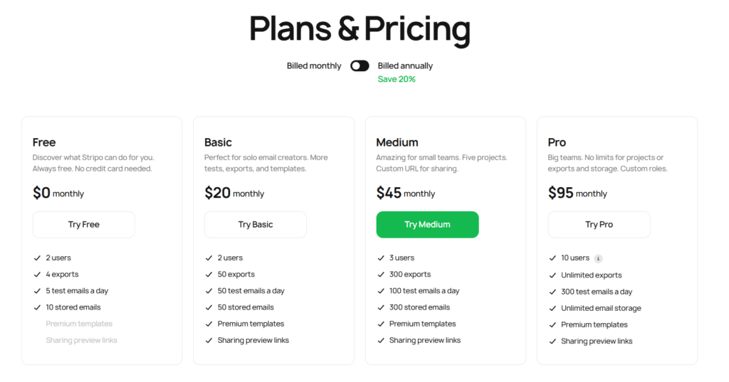 Stripo operates on a freemium model with tiered pricing. The free tier allows users to create up to 4 monthly exports with limited features, while the Basic plan starts at $15 monthly. For agencies and enterprises, the platform offers more advanced plans, which include white-label options, real-time co-editing, and priority support(Mark Savant Media).